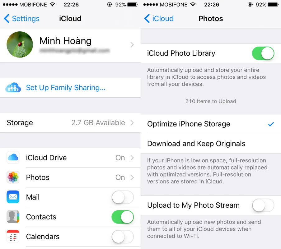 Một trong những cách đơn giản nhất để giải phóng không gian trên iPhone là thực hiện việc đồng bộ hóa hình ảnh. Để làm được việc này, bạn hãy truy cập vào Settings > iCloud > Photos và bật tùy chọn iCloud Photo Library. Hãy chắc chắn rằng tùy chọn Optimize iPhone Storage đã được đánh dấu, việc này sẽ giúp tối ưu hóa dung lượng lưu trữ bằng cách giảm chất lượng hình ảnh trên thiết bị, đồng thời chuyển toàn bộ ảnh gốc lên iCloud.