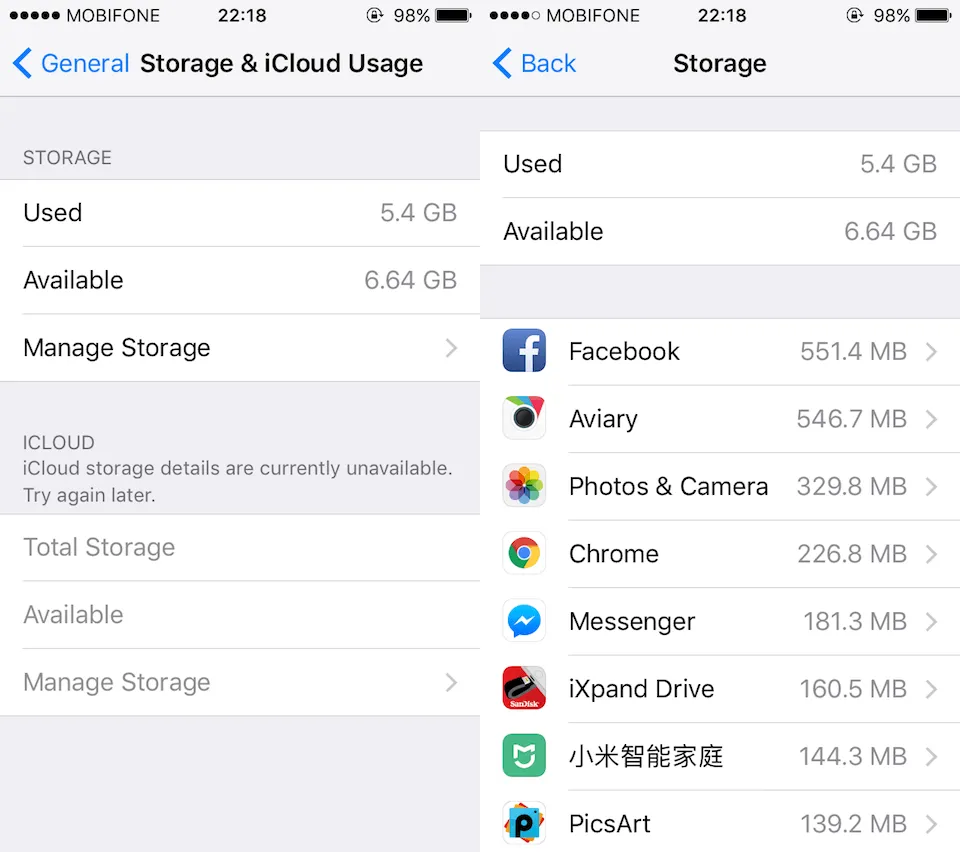 Nếu muốn lấy lại bộ nhớ trên iPhone, bạn hãy vào Settings > General > Storage & iCloud Usage (hoặc iPhone Storage) > Manage Storage. Cửa sổ tiếp theo sẽ liệt kê toàn bộ danh sách các ứng dụng và bộ nhớ chiếm dụng tương ứng, người dùng chỉ cần chọn vào những cái không cần thiết, sau đó nhấn Delete App để xóa bỏ ứng dụng (bao gồm dữ liệu và bộ nhớ đệm) khỏi thiết bị. Khi hoàn tất, bạn có thể cài đặt lại ứng dụng từ App Store.