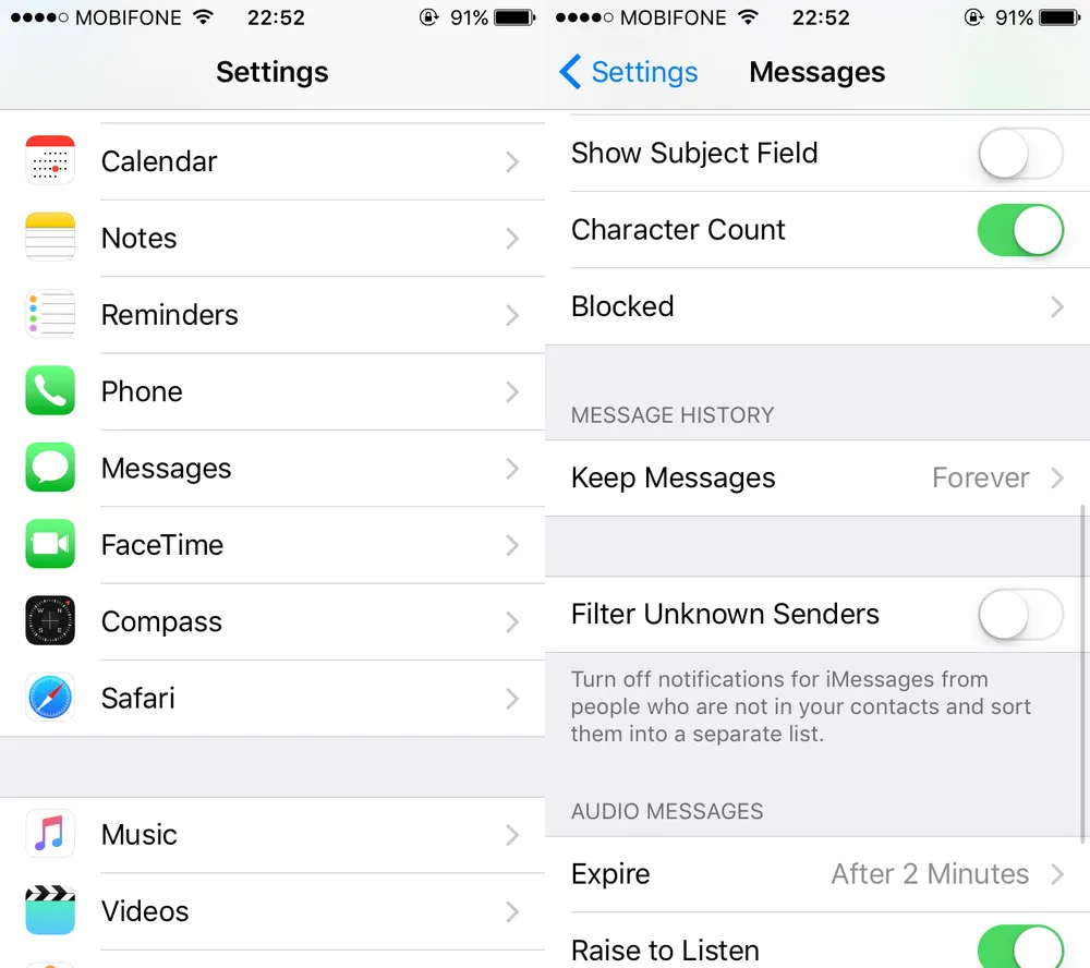 Theo mặc định, ứng dụng Messages trên iOS sẽ lưu lại toàn bộ nội dung tin nhắn, hình ảnh… và mọi thứ mãi mãi, dung lượng chiếm dụng đôi khi có thể lên đến vài GB. Do đó, nếu muốn làm trống bộ nhớ thiết bị, bạn hãy vào Settings > Messages > Keep Messages và thay đổi thành 30 Days (tự động xóa tin nhắn sau 30 ngày) hoặc 1 Year.