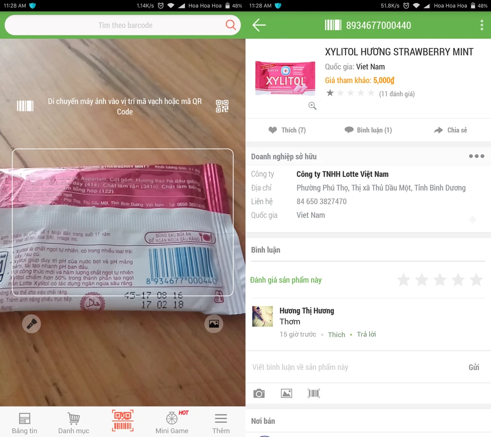 Khi hoàn tất, bạn chỉ cần bấm vào biểu tượng mã vạch trên màn hình, sau đó hướng camera vào mã vạch trên sản phẩm để ứng dụng đọc thông tin. Kết quả trả về sẽ bao gồm địa chỉ, số điện thoại, quốc gia, tên sản phẩm, mức giá và những đánh giá từ phía khách hàng.