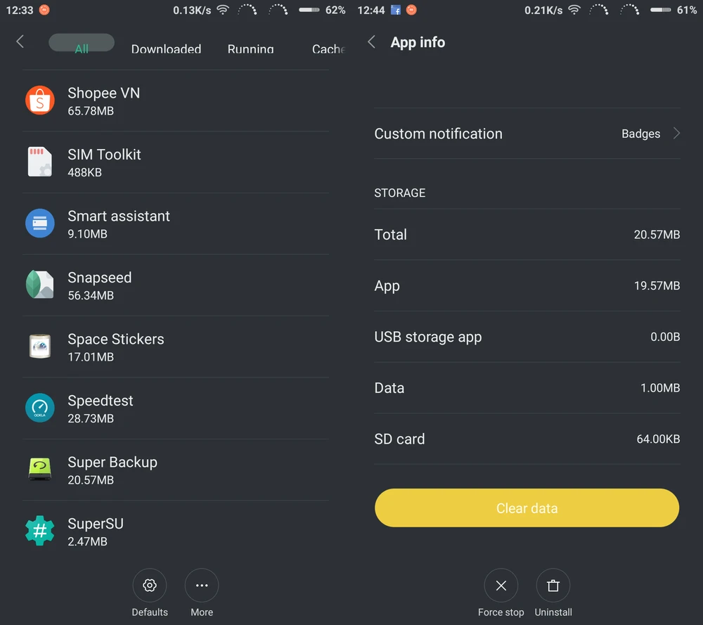 Thay vì phải gỡ bỏ ứng dụng, bạn chỉ cần xóa bớt bộ nhớ tạm thời bằng cách vào Settings (cài đặt) > Apps (ứng dụng), chọn các ứng dụng có dung lượng lớn như Facebook, Messenger… rồi nhấn Clear Cache. Nếu máy đã root, bạn có thể chuyển bớt các ứng dụng đã cài đặt sang thẻ nhớ thông qua ứng dụng App2SD.