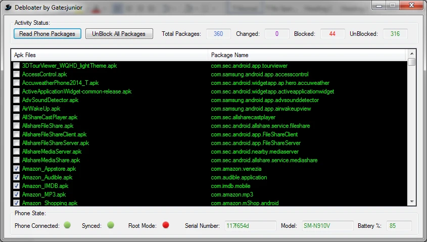 - Bước 3: Tiếp theo, bạn nhấp vào tùy chọn Read Phone Packages để đọc toàn bộ gói ứng dụng được cài đặt trên thiết bị. Khi hoàn tất, người dùng chỉ cần sử dụng tính năng Filter để lọc ra các ứng dụng cần xóa, sau đó đánh dấu rồi nhấn Apply để gỡ bỏ.