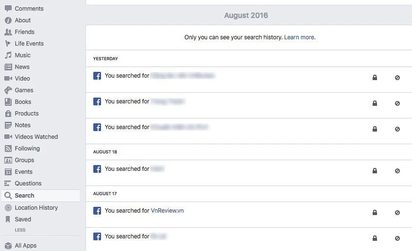 Mặc định, Facebook sẽ lưu lại toàn bộ từ khóa, nội dung bạn vừa tìm kiếm trước đó. Do vậy, nếu muốn bảo mật thông tin, người dùng có thể truy cập vào trang Facebook cá nhân và chọn View Activity Log (nhật kí hoạt động). Sau đó tìm đến tùy chọn Search trong menu bên trái (nằm phía dưới mục Photos, Likes và Comments).