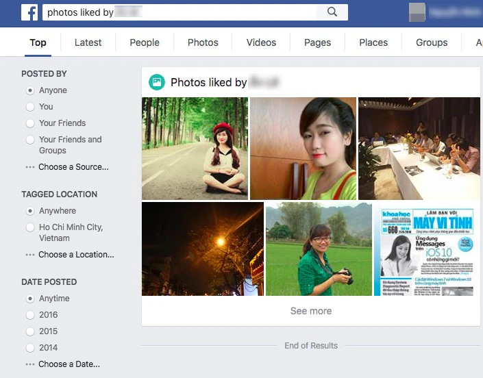 Ngược lại, nếu muốn xem những hình ảnh mà bạn bè đã ẩn khỏi Timelines, bạn chỉ cần sử dụng câu lệnh “photos of <tên bạn bè>”. Sau đó, bạn có thể lọc kết quả theo vị trí, thời gian… hoặc nhấn See more để xem toàn bộ.