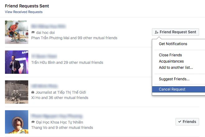 Nếu muốn hủy những yêu cầu kết bạn đã gửi đi trước đó, bạn hãy nhấp vào biểu tượng kết bạn ở bên cạnh nút Home và chọn See all (xem tất cả) > View Sent Requests (xem lời mời đã gửi) Sau đó, rê chuột lên tùy chọn Friend Request Sent (đã gửi lời mời kết bạn) > Cancel Request (hủy lời mời).