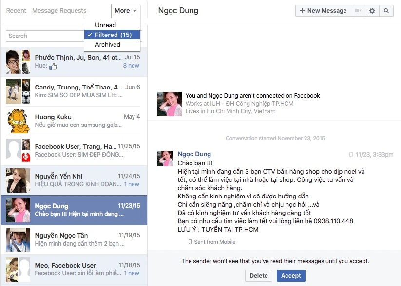 Để truy cập vào hộp thư bí mật trên smartphone, bạn hãy mở ứng dụng Messenger, chọn Settings (cài đặt) > People > Message Requests (tin nhắn đang chờ) > See filtered requests (xem tin nhắn đang chờ). Nếu đang sử dụng máy tính, người dùng chỉ cần kích vào biểu tượng trò chuyện, nhấn See All (xem tất cả) > Message Requests (tin nhắn đang chờ) ở góc trên bên trái, hoặc nhấn More và chọn Filtered.