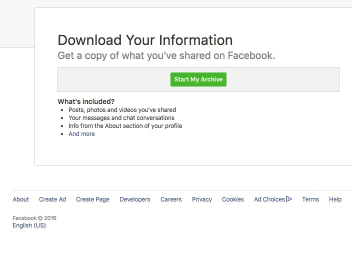 Đầu tiên, bạn hãy truy cập vào địa chỉ https://www.facebook.com/settings, nhấp vào tùy chọn Download a copy > Start My Archive và làm theo các bước hướng dẫn. Khi hoàn tất, người dùng có thể dễ dàng xem lại nội thông qua các file html.