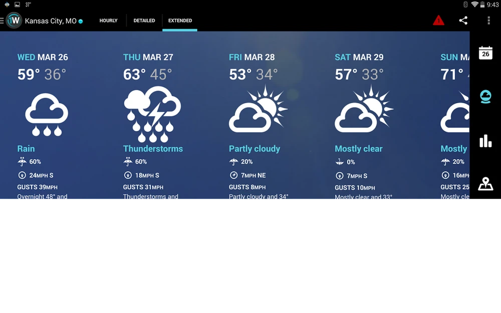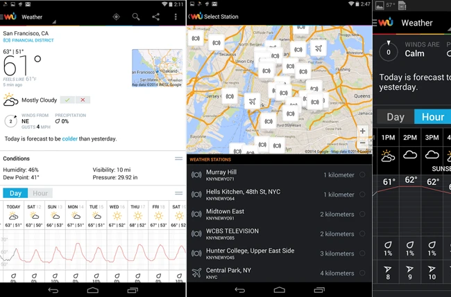 Weather Underground được hỗ trợ bởi cộng đồng những người quan tâm tới dự báo thời tiết trên toàn thế giới. Với dữ liệu từ hơn 33.000 trạm thời tiết cá nhân, ứng dụng đưa ra những thông báo có độ chính xác cao về tình hình thời tiết, nhiệt độ, dự báo thời tiết theo giờ và biểu đồ dễ đọc với những yếu tố như tóc độ gió và khả năng mưa. Weather còn đưa ra những cảnh báo nguy hiểm và mô tả điều kiện bầu trời.