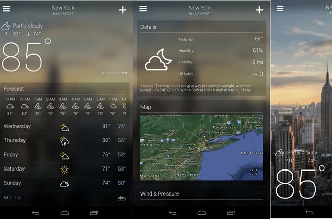 Đáng tin cậy và nổi tiếng, ứng dụng thời tiết chính thức của Yahoo là công cụ tuyệt vời để cập nhật những thông tin cơ bản về thời tiết. Yahoo Weather không đi kèm quảng cáo và hoạt động nhanh hơn hều hết các phần mềm khác trong danh sách này. Ứng dụng cung cấp những dữ liệu về nhiệt độ, tầm nhìn, tốc độ gió và dự báo thời tiết. Yahoo Weather thậm chí còn đồng bộ với Flickr để cung cấp ảnh cho phù hợp với địa điểm.