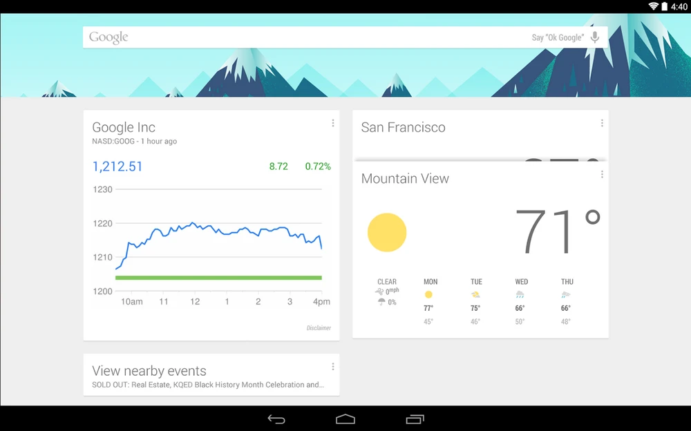 Google Now có những tính năng nổi bật như thông báo tình hình thời tiết ở thời điểm hiện tại và dự báo thời tiết trong vài ngày sau, độ ẩm, tốc độ gió và nguy cơ có mưa. Ứng dụng sở hữu giao diện gọn gàng với những biểu tượng giống phiên bản trên desktop.