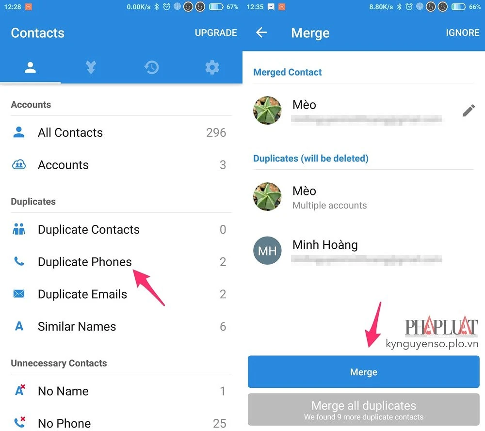 Để hợp nhất các địa chỉ liên lạc, bạn chỉ cần bấm chọn rồi nhấn Merge hoặc Merge all duplicates, chờ một lát để quá trình này hoàn tất. Quá trình này nhanh hay chậm còn tùy thuộc vào số lượng liên lạc trên smartphone.