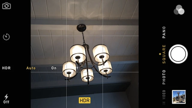 Tính năng HDR (High Dynamic Range) sẽ giúp bạn có được những bức ảnh có độ tương phản cao, màu sắc rực rỡ hơn so với bình thường. Để kích hoạt, bạn chỉ cần chạm vào nút HDR và chuyển nó sang chế độ On. Lưu ý, tính năng này chỉ có sẵn từ iPhone 5S trở lên.