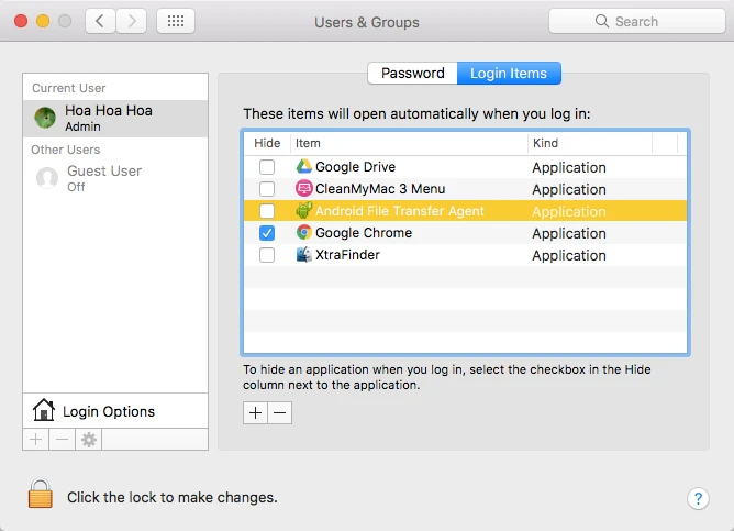 Đối với MacBook, người dùng chỉ cần mở System Preferences > User & Group > Login Items, chọn các ứng dụng không cần thiết và nhấn vào biểu tượng dấu "-" để loại bỏ.