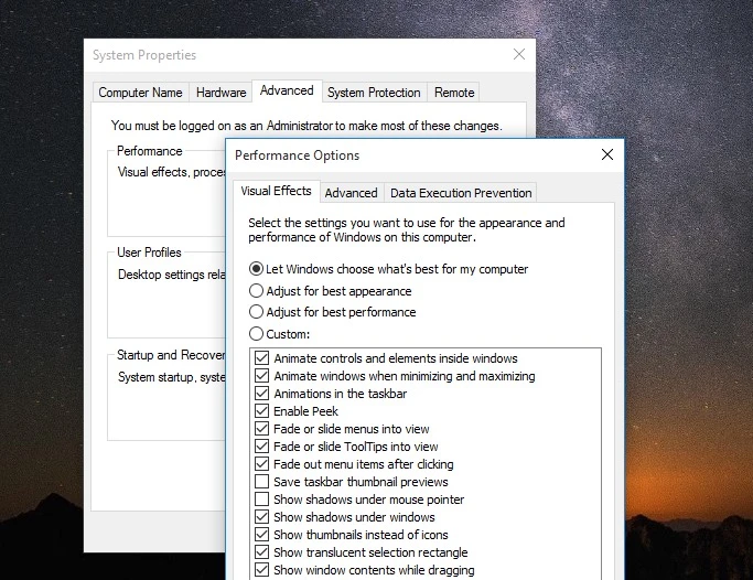 Nếu đang sử dụng Windows, bạn nhấn tổ hợp phím Win + S và gõ vào khung tìm kiếm từ khóa View advanced system settings, Performance > Settings. Sau đó, bạn đánh dấu vào tùy chọn Adjust for best performance để tắt bớt các hiệu ứng đặc biệt và ảnh động.