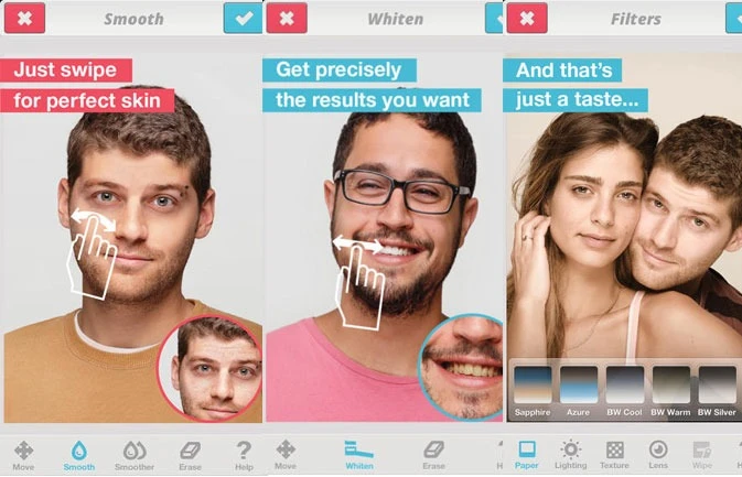 FaceTune giúp khắc phục những khiếm khuyết trên khuôn mặt như răng không trắng, vết thâm, tàn nhang… Bạn cũng có thể che trán hói hoặc thay đổi màu mắt.