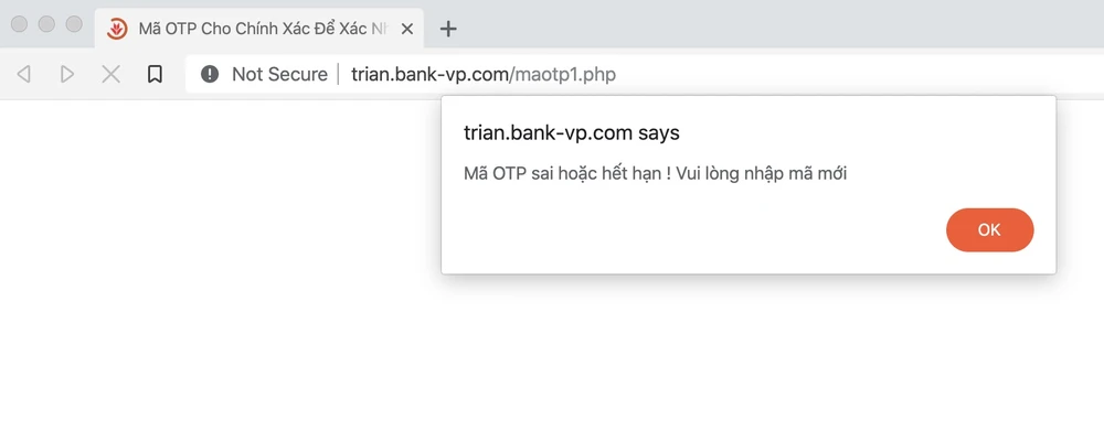 Ở bước tiếp theo, chúng sẽ dụ người dùng nhập mã OTP (mật khẩu một lần). Lúc này, kẻ gian có thể lập lệnh và sử dụng mã OTP này để hoàn tất việc chuyển tiền của bạn sang một tài khoản khác hoặc thay đổi một số thông tin quan trọng, do đó bạn cần phải thực sự cảnh giác và để ý kỹ mọi thứ.