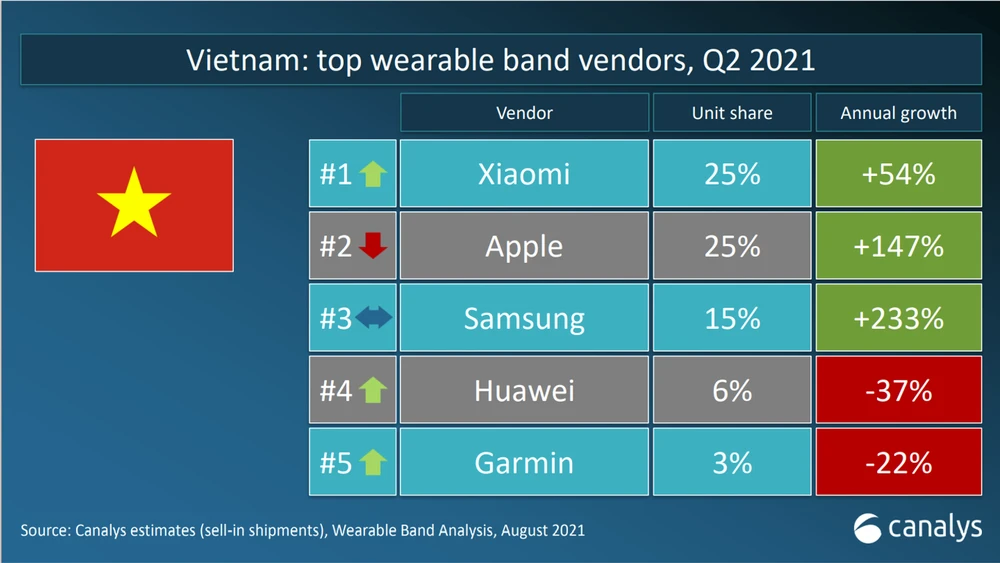 Chỉ tính riêng trong quý 2 năm 2021, Xiaomi đã có mức tăng trưởng lên đến 54%, chiếm 25% thị trường so với cùng kì năm ngoái. Hiện công ty đang giữ vị trí dẫn đầu trong mảng thiết bị đeo tay tại Việt Nam và cả thế giới.