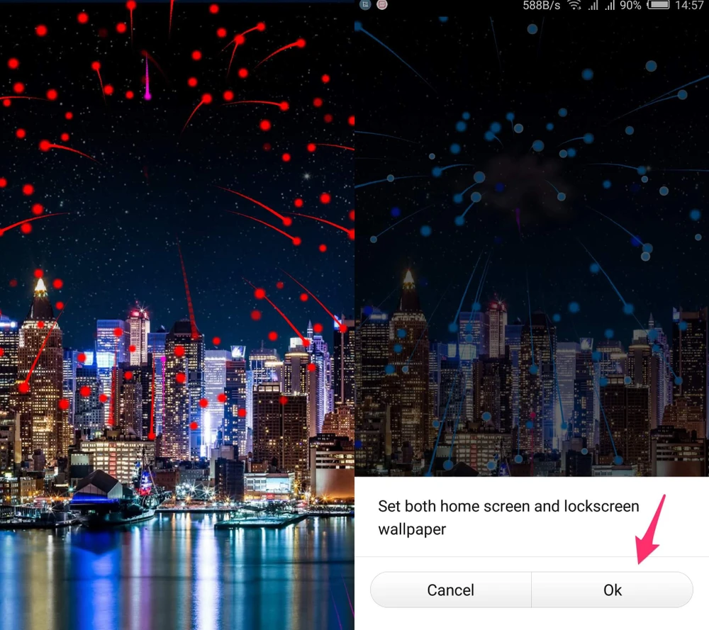 Khi thiết lập hoàn tất, bạn hãy nhấn Start fireworks để xem trước các hiệu ứng. Nếu đã cảm thấy vừa ý, người dùng chỉ cần truy cập vào phần Settings (cài đặt) > Display (hiển thị) > Wallpaper (hình nền) > Live Wallpaper (ảnh động) > Fireworks 2017 (pháo bông 2017), nhấn Settings (cài đặt) > OK để đặt ảnh động làm hình nền và màn hình khóa.