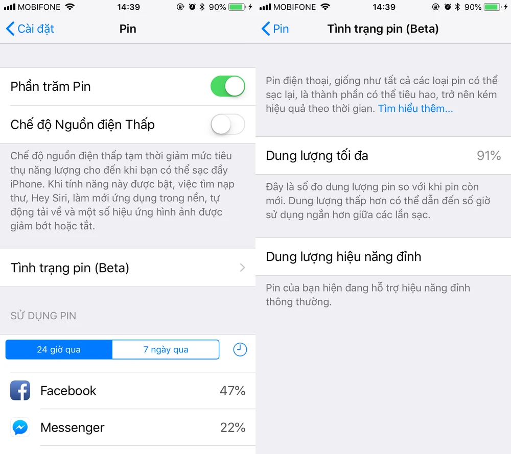 Khi cài đặt thành công, người dùng chỉ cần vào Settings (cài đặt) > Battery (pin). Tại đây sẽ xuất hiện thêm một tùy chọn mới là Battery Health (tình trạng pin). Khi nhấp vào, bạn có thể biết được sức khỏe của viên pin ở thời điểm hiện tại (Maximum Capacity - dung lượng tối đa). Ví dụ như hình bên dưới, viên pin trên iPhone của người viết còn khoảng 91% hiệu suất so với ban đầu, vẫn đảm bảo hiệu năng và không bị chậm thiết bị.
