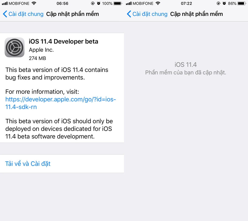 Đầu tiên, bạn hãy truy cập vào Settings (cài đặt) > General (cài đặt chung) > Software Update (cập nhật phần mềm) và tải về bản cập nhật iOS 11.3 hoặc iOS 11.4 Beta (dung lượng thay đổi tùy từng thiết bị).