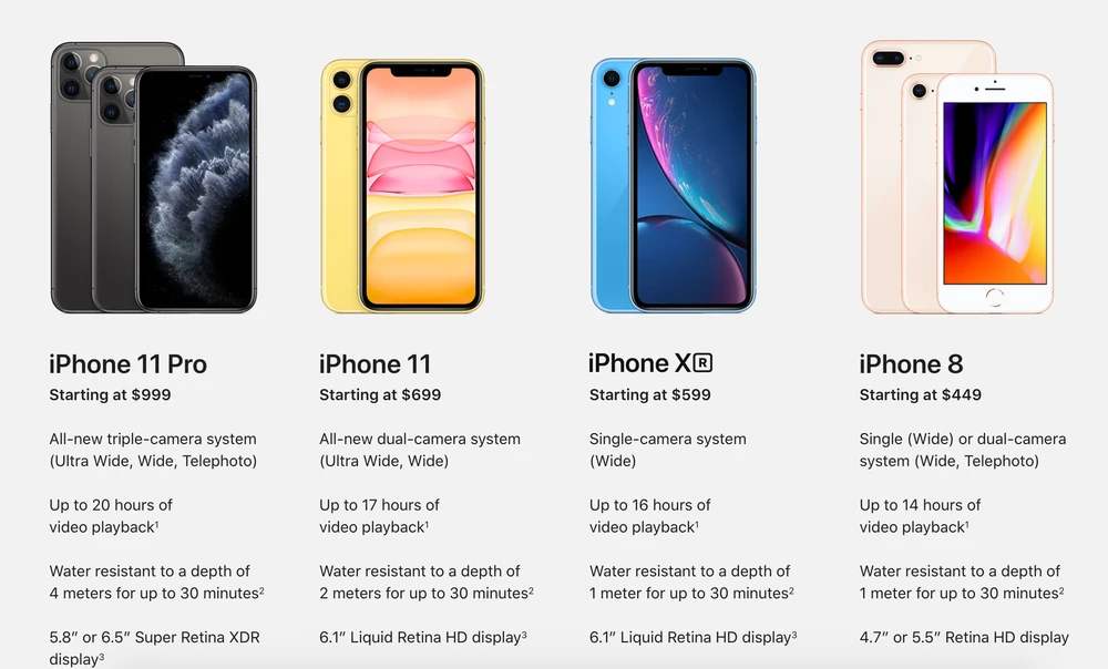 Tính đến thời điểm hiện tại, Apple chỉ bán ra các mẫu điện thoại gồm iPhone 8 (449 USD), iPhone 8 Plus (549 USD), iPhone XR (599 USD), iPhone 11 (699 USD), iPhone 11 Pro (999 USD), và iPhone 11 Pro Max (1.099 USD).