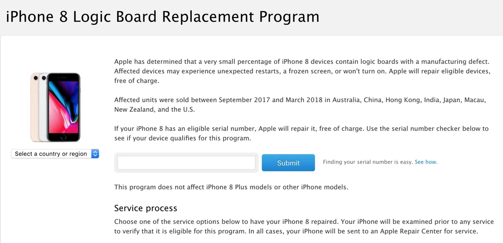 Apple cho biết những mẫu iPhone 8 bị lỗi mạch logic có thể sẽ tự khởi động lại, màn hình bị treo… Do đó, công ty đã quyết định thông báo đến người dùng và sửa chữa miễn phí nếu sản phẩm đủ điều kiện. Những mẫu máy bị ảnh hưởng được bán từ tháng 9-2017 đến tháng 3-2018 tại Úc, Trung Quốc, Hong Kong, Ấn Độ, Nhật Bản, Ma Cao, New Zealand và Mỹ. Tất nhiên, nó hoàn toàn có thể xuất hiện tại Việt Nam thông qua đường xách tay.