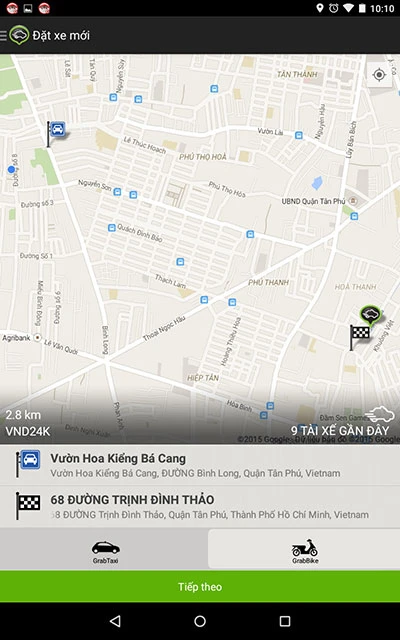 Tiếp theo, bạn cần lựa chọn điểm bắt đầu và điểm cần đến bằng cách nhập địa chỉ vào khung tìm kiếm, sử dụng bản đồ hoặc kéo thả biểu tượng GrabBike đến một vị trí bất kỳ. Khi đó, ứng dụng sẽ hiển thị chiều dài đoạn đường và giá tiền ở góc trái bên dưới, nếu chấp nhận đi, bạn chuyển sang bước tiếp theo. Nhập vào họ tên, địa chỉ email và số điện thoại, sau đó sử dụng mã xác nhận của chương trình gửi về để kích hoạt tài khoản.