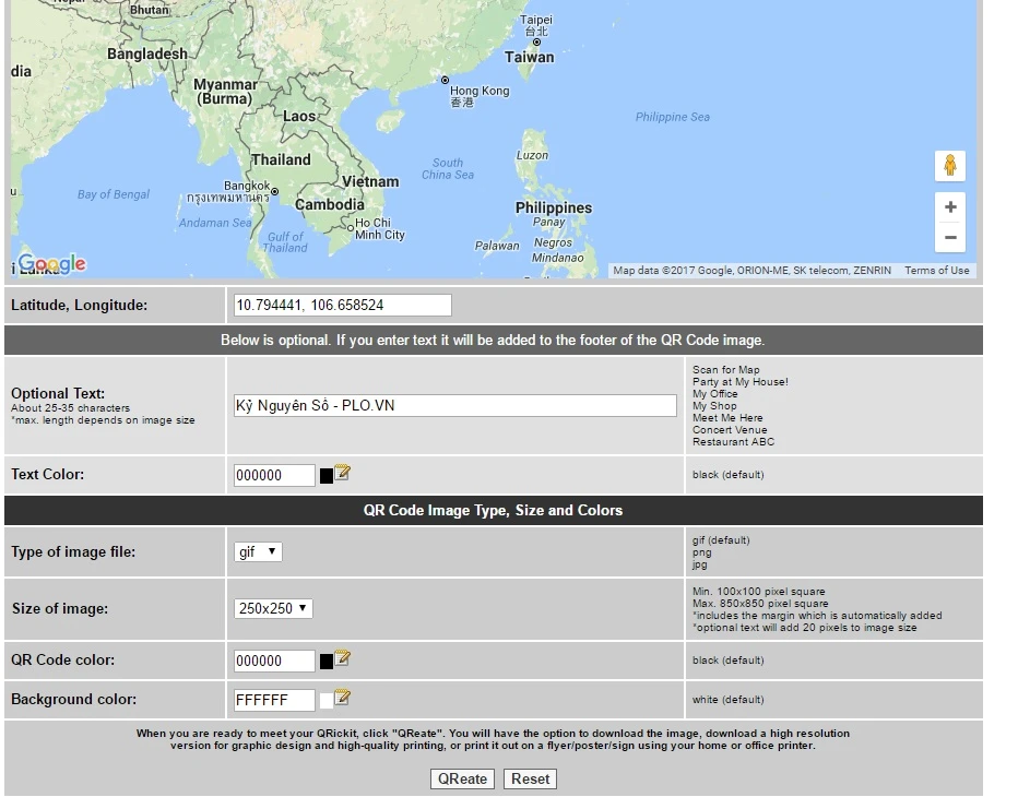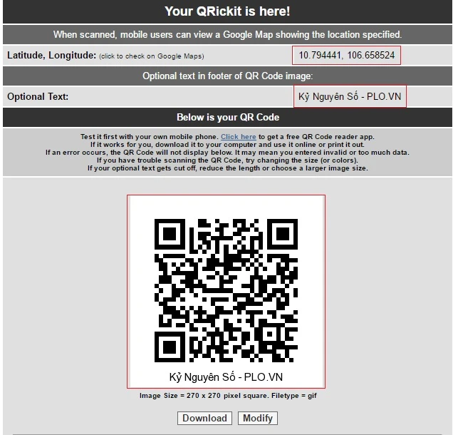Giao diện trang web tạo mã QR cho tính năng xác định vị trí doanh nghiệp trên bản đồ Google Maps