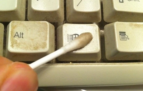 Đầu tiên, bạn thấm một chút nước vệ sinh vào chiếc bông ngoáy tai, khăn giấy hoặc vải cotton, sau đó từ từ lau nhẹ lên bề mặt bàn phím. Tránh đổ trực tiếp dung dịch lên bàn phím vì rất dễ gây chập cháy sau khi hoàn tất quá trình dọn dẹp.