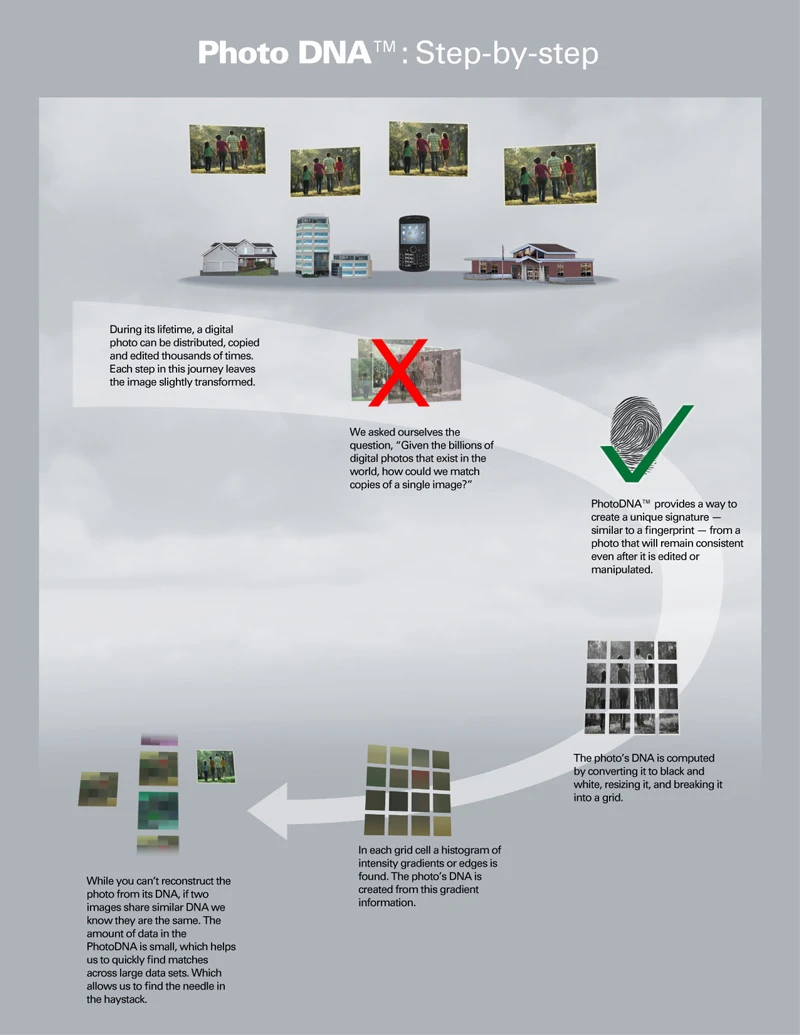 Công nghệ PhotoDNA chuyển đổi hình ảnh sang định dạng điểm ảnh đen trắng (greyscale) và có kích cỡ đồng nhất, từ đó sẽ phân nhỏ hình ảnh thành các ô vuông, gán giá trị số độc nhất cho từng phần màu sắc tìm được trong những ô vuông đó. Khi kết hợp với nhau, những con số này đại diện cho một “chữ ký PhotoDNA” hoặc chữ ký hình ảnh, nhờ đó chúng ta có thể so sánh các chữ ký với những hình ảnh khác để tìm kiếm những bản sao của hình ảnh được cung cấp với độ chính xác đáng kinh ngạc.
