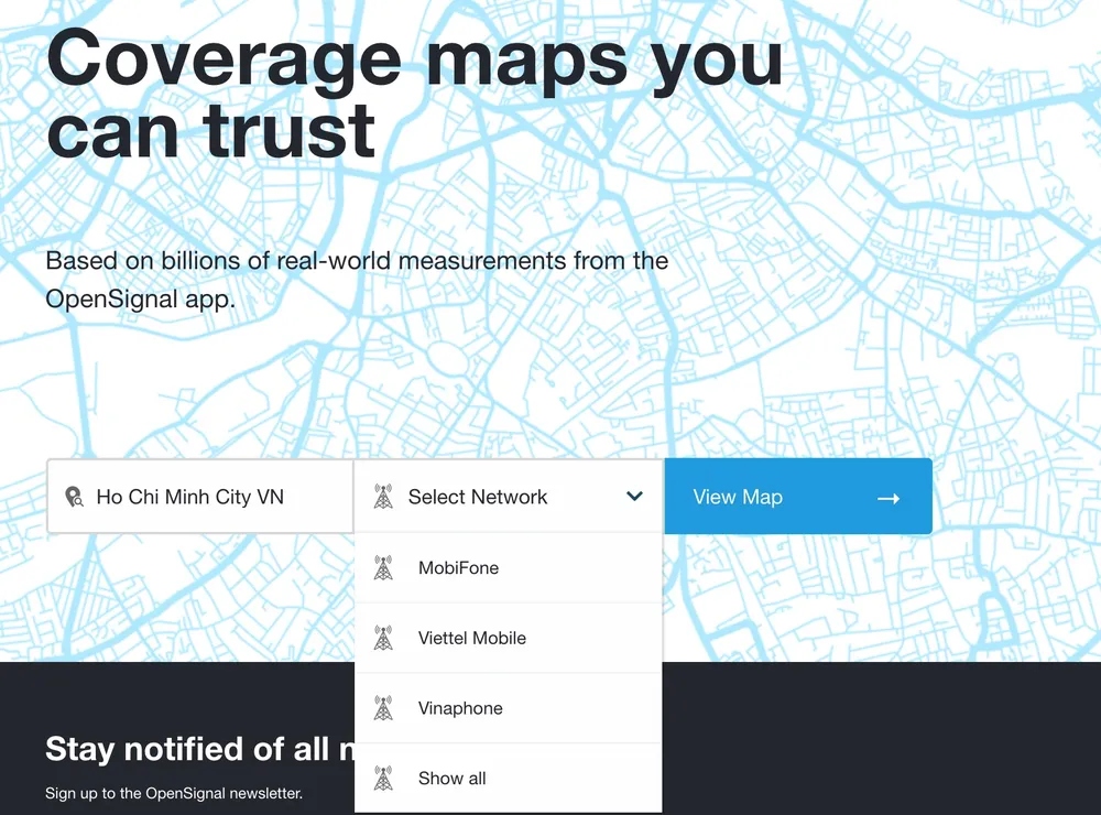 Đầu tiên, bạn hãy mở trình duyệt trên smartphone hoặc máy tính và truy cập vào địa chỉ https://opensignal.com/, kéo xuống bên dưới và chọn nhà mạng cần kiểm tra rồi nhấn View Map (nếu không thấy Vietnamobile, bạn cứ chuyển sang bước tiếp theo). Lúc này trên bản đồ sẽ hiển thị các trạm thu phát sóng (BTS) tại từng khu vực, màu xanh lá đồng nghĩa với việc tín hiệu mạnh và ngược lại.