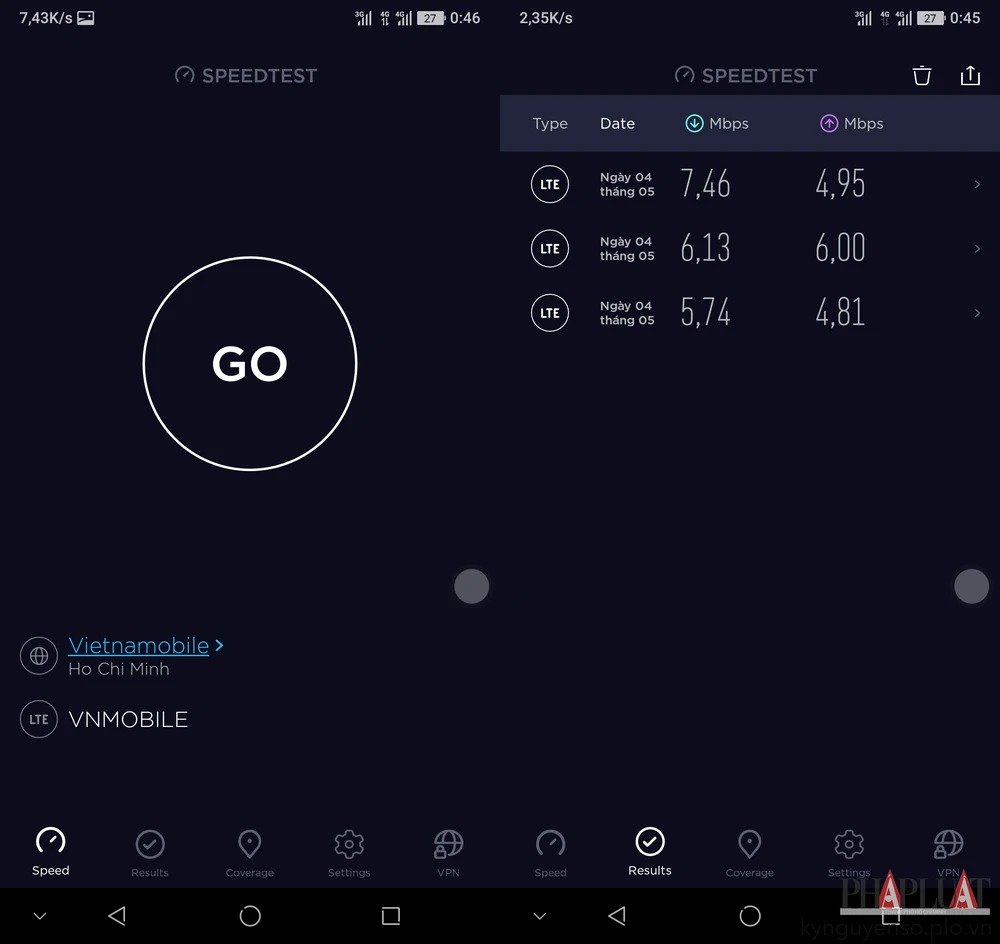 Khi kiểm tra tốc độ download và upload bằng phần mềm Speedtest ở khu vực quận Bình Tân, người viết nhận thấy tốc độ 4G của Vietnamobile còn khá thấp, chỉ dao động trong khoảng 6-8 Mbps. Tương tự, khu vực quận Tân Bình cũng cho kết quả chỉ khoảng 5 Mbps, tất nhiên con số này sẽ thay đổi tùy vào địa điểm bạn kiểm tra. Thêm vào đó, mạng 4G của Vietnamobile vẫn đang trong giai đoạn thử nghiệm nên sẽ chưa ổn định hoàn toàn.