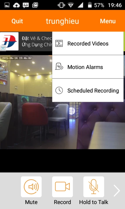 - Trên Android: bạn nhấn vào biểu tượng ở góc phải, chọn Add by QR Code để thêm thiết bị vào bằng mã QR, lúc này bạn nhấn vào nút Generate QR Code trên thiết bị iOS để tạo mã QR và đưa vào khung để quét. Ngoài ra, bạn có thể thêm thiết bị bằng tùy chọn Add by CID, nhập vào 3 thông tin CID, username và password. Xong chỉ việc nhấn vào thiết bị ở khung bên trái để xem trực tuyến đoạn video clip đang quay. Trong giao diện này, bạn có thể vào nút Menu và chọn Recorded videos (quay lại đoạn video clip), motion alarm (báo động bằng âm thanh khi xuất hiện chuyển động) hoặc chọn Scheduling recording để chọn khoảng thời gian quay video giám sát.