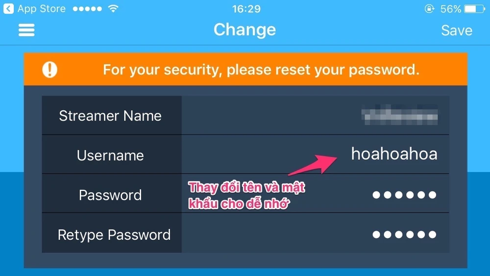 - Bước 2: Giao diện chính của AtHome Video Streamer khá đơn giản với màn hình camera, CID (định danh camera), Username (tên đăng nhập) và Password (mật khẩu) dùng để kết nối từ xa. Để dễ nhớ hơn, người dùng có thể chạm vào biểu tượng menu ở góc trên bên trái, sau đó nhấn Change và thay đổi lại tùy ý. Lưu ý, mật khẩu phải có độ dài tối thiểu từ 6 ký tự trở lên, bao gồm chữ thường, chữ hoa và số.