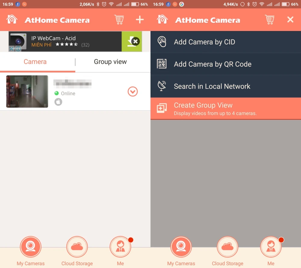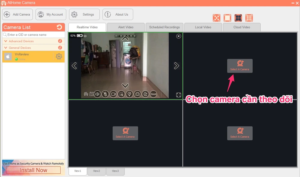 • Android: Nếu muốn dùng các thiết bị Android để theo dõi từ xa, bạn chỉ cần cài đặt phiên bản AtHome Camera. Khi hoàn tất, người dùng hãy đăng nhập bằng tài khoản tương ứng, tự động các camera đã thêm trước đó sẽ được hiển thị. Nếu không, bạn cần nhấn vào biểu tượng dấu cộng ở góc trên bên phải và chọn Add Camera by CID hoặc Add Camera by QR Code. Tùy chọn Search in Local Network sẽ tự động quét các thiết bị quan sát trong mạng.