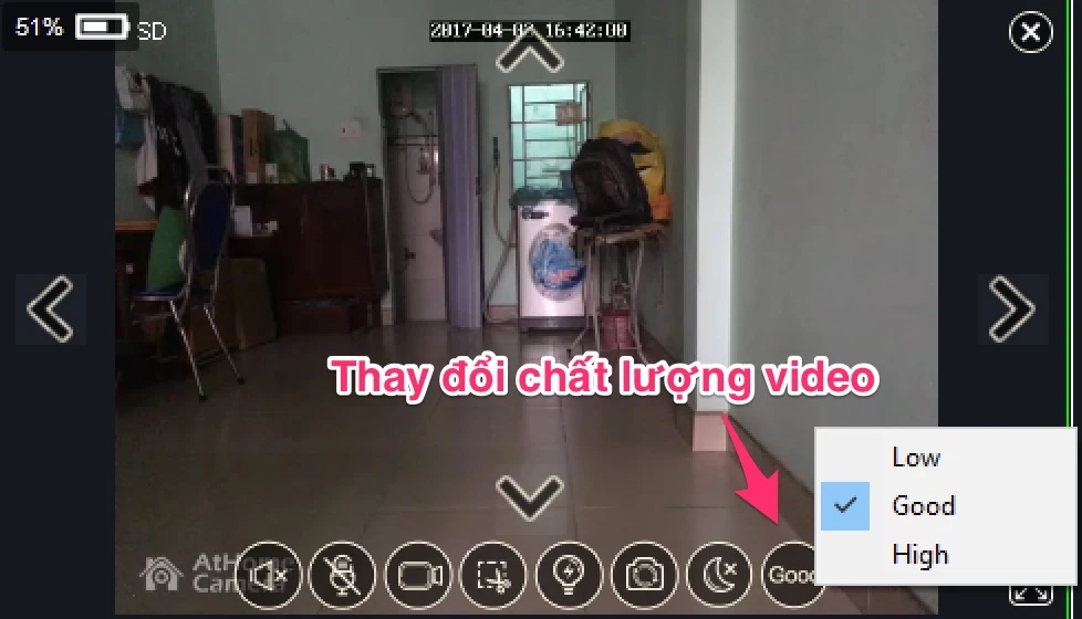 Ứng dụng hỗ trợ kết nối tối đa 12 thiết bị quan sát trên ba màn hình khác nhau. Khi rê chuột lên một màn hình bất kỳ, người dùng có thể nói thông qua micro, nghe âm thanh thu lại từ camera, ghi hình, chụp ảnh, chuyển đổi qua lại giữa camera trước/sau và chế độ quay ban đêm bằng cách bấm vào các biểu tượng tương ứng. Nếu muốn video hiển thị rõ nét, bạn có thể chọn chất lượng High, Good hoặc Low (giảm dung lượng nhưng tốc độ nhanh).