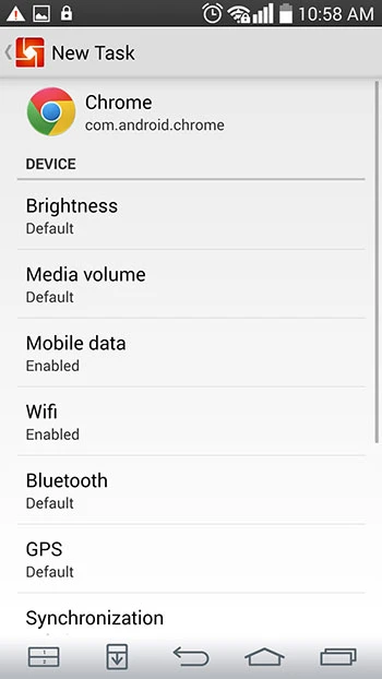 Ví dụ nếu bạn muốn bật Wi-Fi khi mở trình duyệt Chrome thì làm như sau: Chọn phần ứng dụng là Chrome rồi kích hoạt mục Wi-Fi thành Enable, tương tự như vậy cho các mục khác như Bluetooth, Mobile data (kết nối dữ liệu tức là 3G, 4G), âm lượng và độ sáng màn hình,… Cuối cùng, bạn lưu điều kiện này lại để μTask bắt đầu áp dụng.