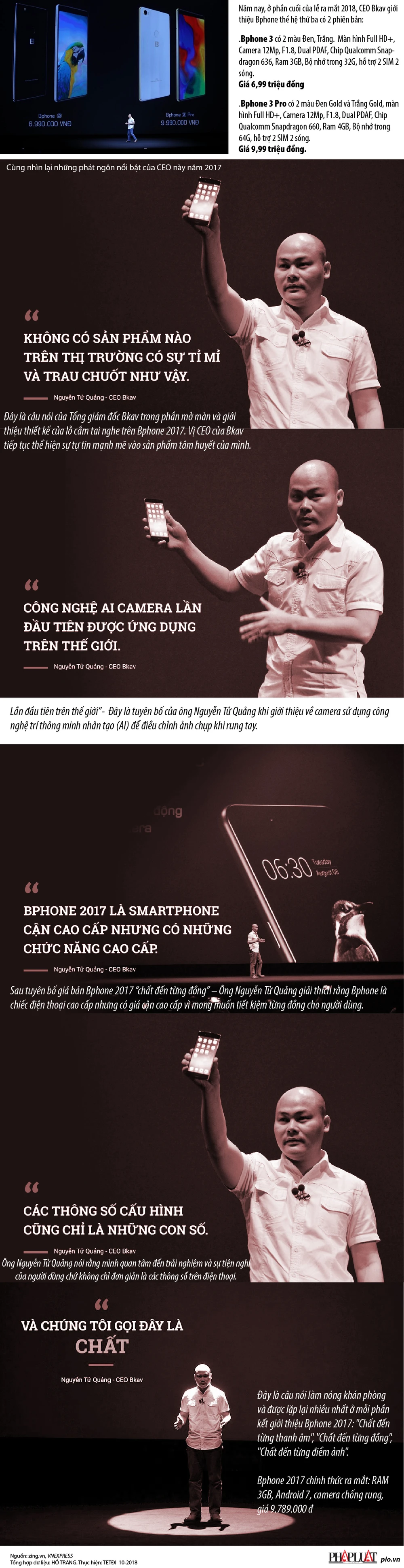 (PLO)- Trước sự kiện Bphone 3 được mở bán chính thức ngày 19-10-2018 với giá 6,99 triệu và 9,99 triệu đồng cho phiên bản Bphone Pro, cùng nhìn lại năm câu nói "chất phát ngất" của CEO Nguyễn Tử Quảng khi ra mắt BPhone 2017.