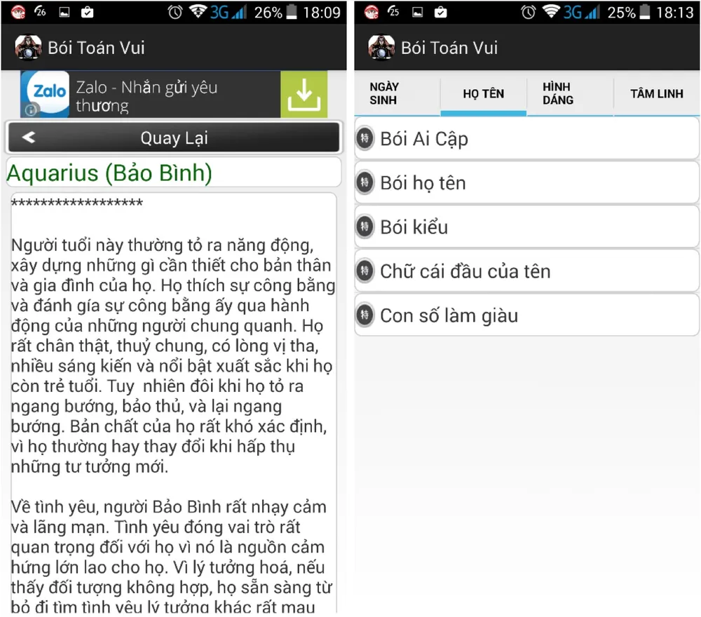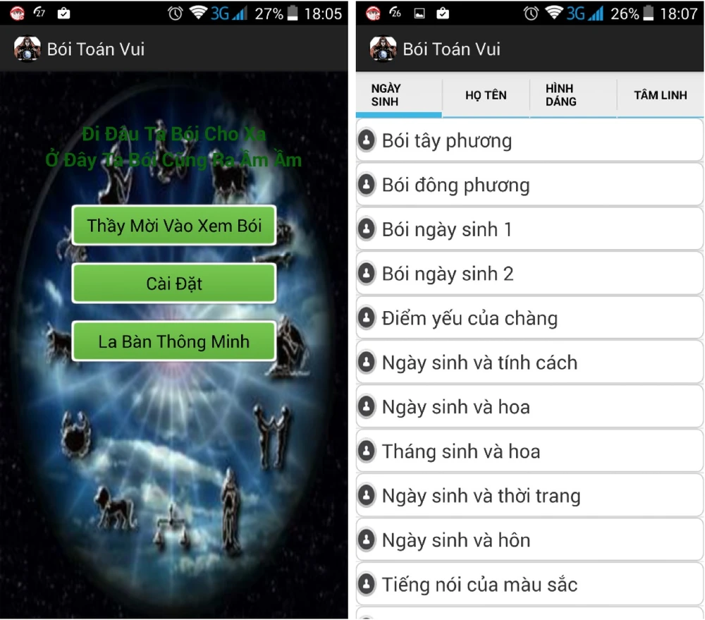 Giao diện ứng dụng khá đơn giản với bốn mục chính gồm bói ngày sinh, họ tên, hình dáng và tâm linh. Bên trong mỗi loại còn rất nhiều phần nhỏ khác như Bói tây phương, Điểm yếu của chàng, Ngày sinh và tính cách…
