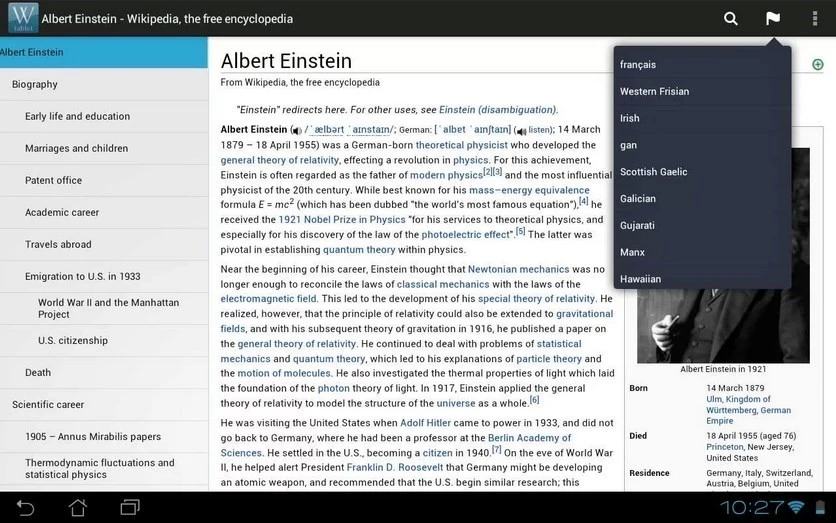 Ngoài ra, nó còn cung cấp một tùy chọn cho phép bạn thay đổi lại ngôn ngữ hiển thị và kích cỡ font chữ, hoặc bạn có thể sử dụng hai ngón tay để thực hiện nhanh hơn các thao tác thu nhỏ/phóng to này. Nhìn chung, ứng dụng này là một kho tàng kiến thức khá đồ sộ được chia sẻ trên Wikipedia, thích hợp cho các bạn sinh viên/giảng viên tham khảo và học tập.