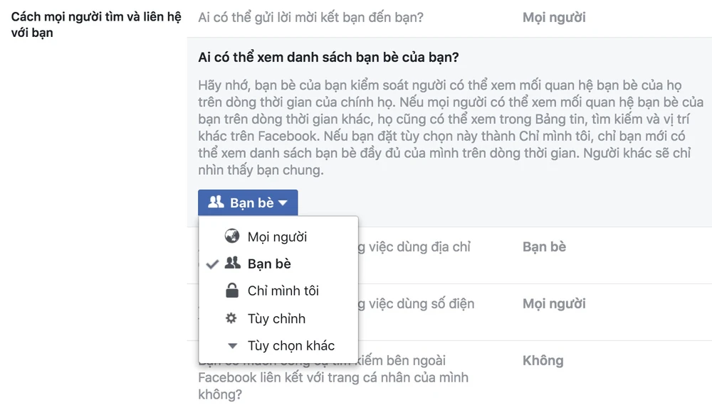 Tại đây sẽ có các lựa chọn gồm Public (mọi người), Friends (bạn bè), Only me (chỉ mình tôi), Custom (tùy chỉnh) và More options (tùy chọn khác). Để người khác không thấy danh sách bạn bè, bạn có thể chuyển thành Only Me hoặc Friends tùy vào nhu cầu.