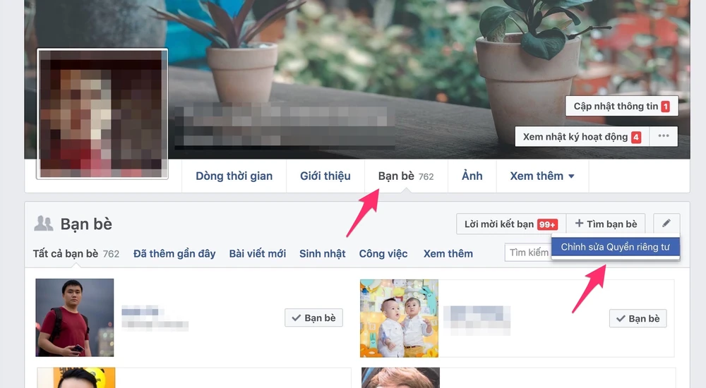 Bên cạnh đó, người dùng cũng có thể truy cập vào trang Facebook cá nhân, bấm vào tùy chọn Friends (bạn bè). Bấm vào biểu tượng cây viết ở góc phải và chọn Edit Privacy (chỉnh sửa quyền riêng tư) và thực hiện tương tự như trên.