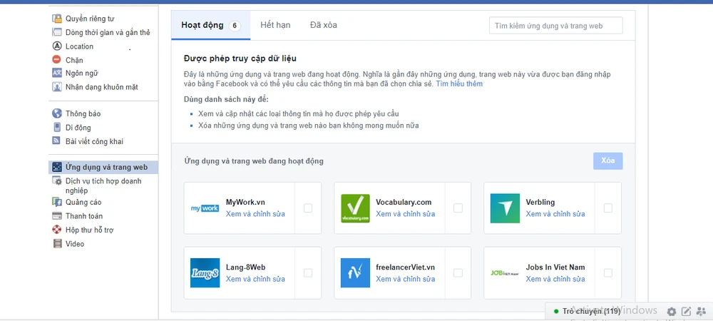 Truy cập vào phần Cài đặt của Facebook, bạn sẽ thấy mình đã cấp quyền cho rất nhiều ứng dụng do bên thứ ba phát triển. Ảnh: Diệu Thảo