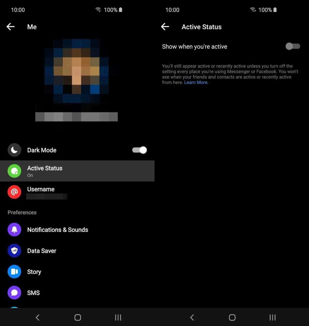 Tương tự như trên, bạn cũng cần mở ứng dụng Messenger lên trước, sau đó bấm vào biểu tượng ảnh đại diện ở góc trên bên trái. Tìm đến mục Active Status (trạng thái hoạt động) và vô hiệu hóa tùy chọn Show when you’re active (hiển thị khi bạn đang hoạt động).