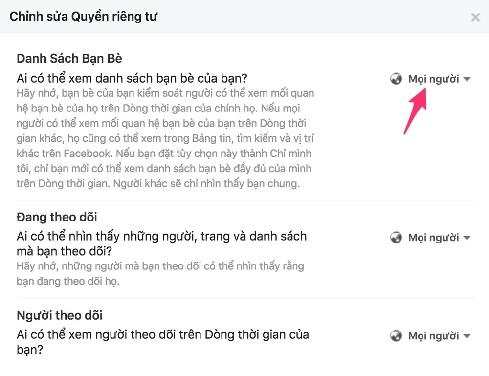 - Bước 3: Tại đây sẽ có ba mục chính gồm Friend List (danh sách bạn bè), Following (đang theo dõi) và Followers (người theo dõi). Nếu không muốn người khác xem danh sách bạn bè, bạn chỉ cần thay đổi từ Public (mọi người) thành Friends (bạn bè) hoặc Only me (chỉ mình tôi). Thực hiện tương tự cho mục Following nếu không muốn người khác biết được bạn vừa like fanpage hoặc theo dõi trang cá nhân của một người nào đó.