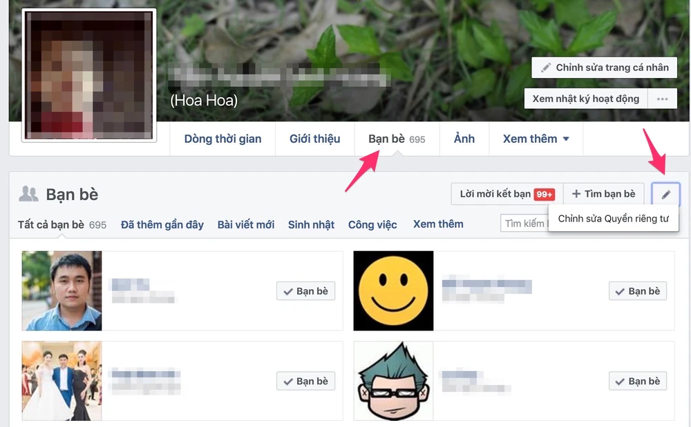 - Bước 2: Chuyển sang mục Friends (bạn bè), nhấp vào biểu tượng cây viết ở góc phải và chọn Edit Privacy (chỉnh sửa quyền riêng tư).