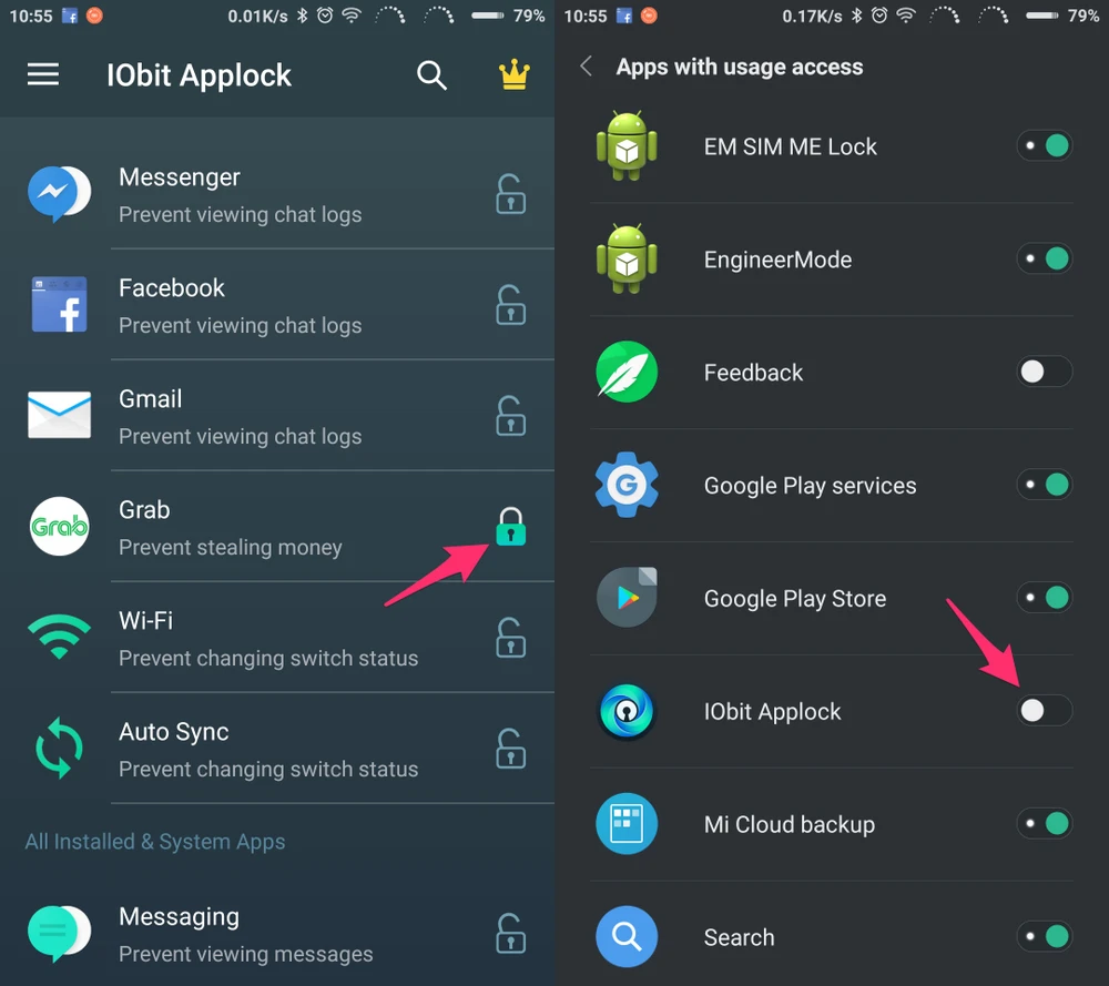 - Bước 3: Giao diện của IObit AppLock khá đơn giản, để bảo vệ các ứng dụng quan trọng như email, tin nhắn, Facebook… bạn chỉ cần chạm vào biểu tượng ổ khóa ở ngay bên cạnh và làm theo các bước hướng dẫn để cấp quyền.