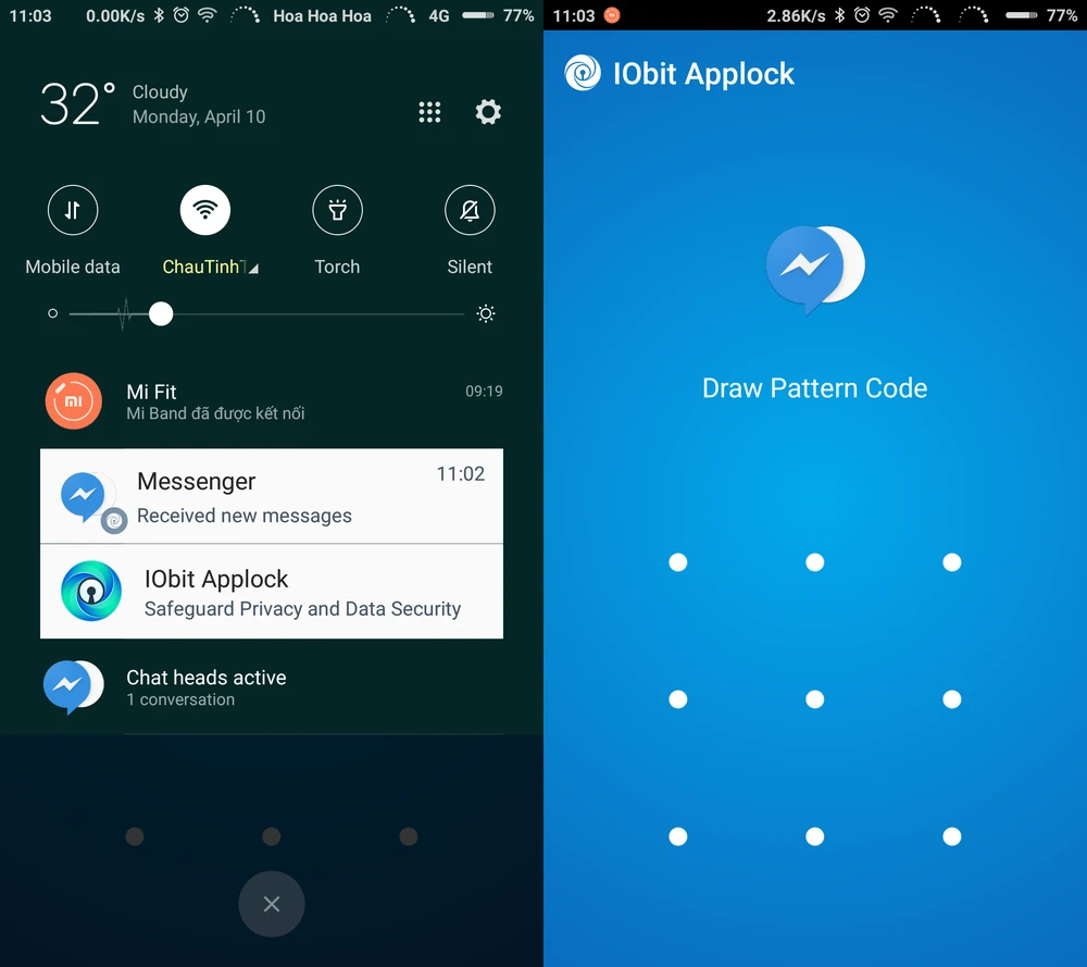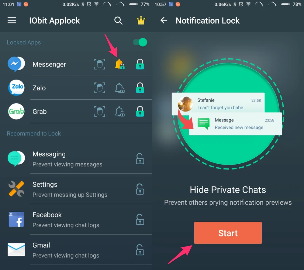 - Bước 5: Mặc định, khi khóa ứng dụng bằng mật khẩu, người khác vẫn có thể đọc được nội dung tin nhắn trên thanh thông báo. Để hạn chế tình trạng trên, bạn có thể kích hoạt tính năng Notification Lock trong menu hoặc nhấn vào biểu tượng cái chuông, sau đó nhấn Start để bắt đầu. Kể từ lúc này, khi bạn bè gửi tin nhắn đến, nội dung sẽ được hiển thị dưới dạng Received new messages.
