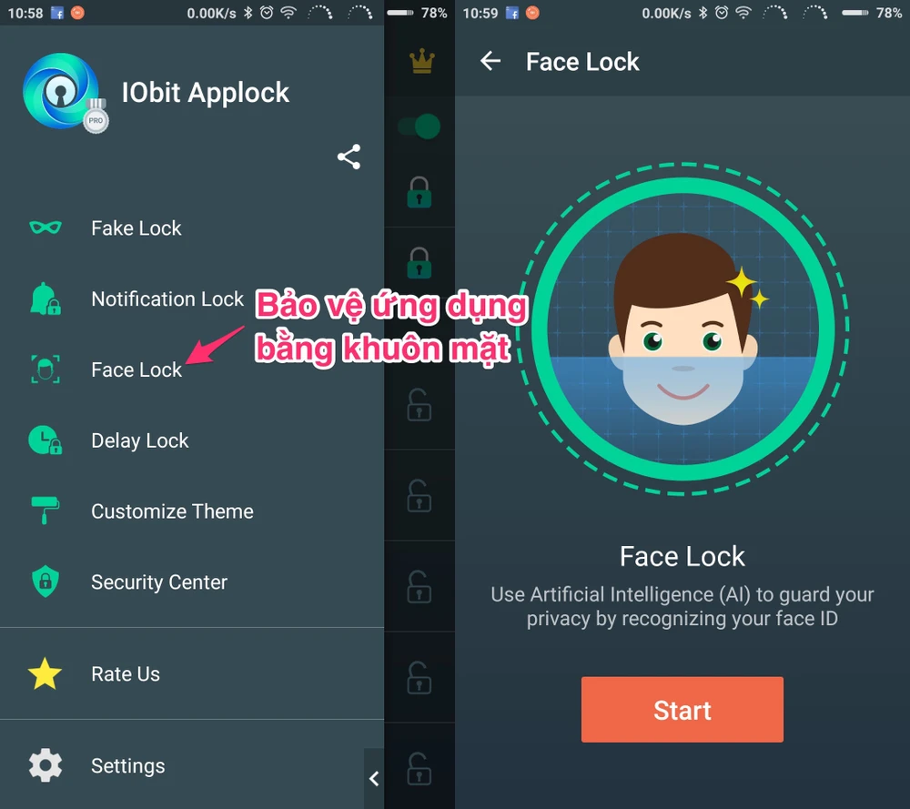 - Bước 6: Để bảo vệ ứng dụng bằng khuôn mặt, người dùng chỉ cần bấm vào biểu tượng menu ở góc trên bên trái và chọn Face Lock > Start > Enable Now, sau đó cấp quyền truy cập camera và làm theo các bước hướng dẫn. Nếu muốn sử dụng thêm các tính năng nâng cao, bạn cần phải nâng cấp lên phiên bản trả phí với mức giá 2,99 USD (khoảng 85.000 đồng).