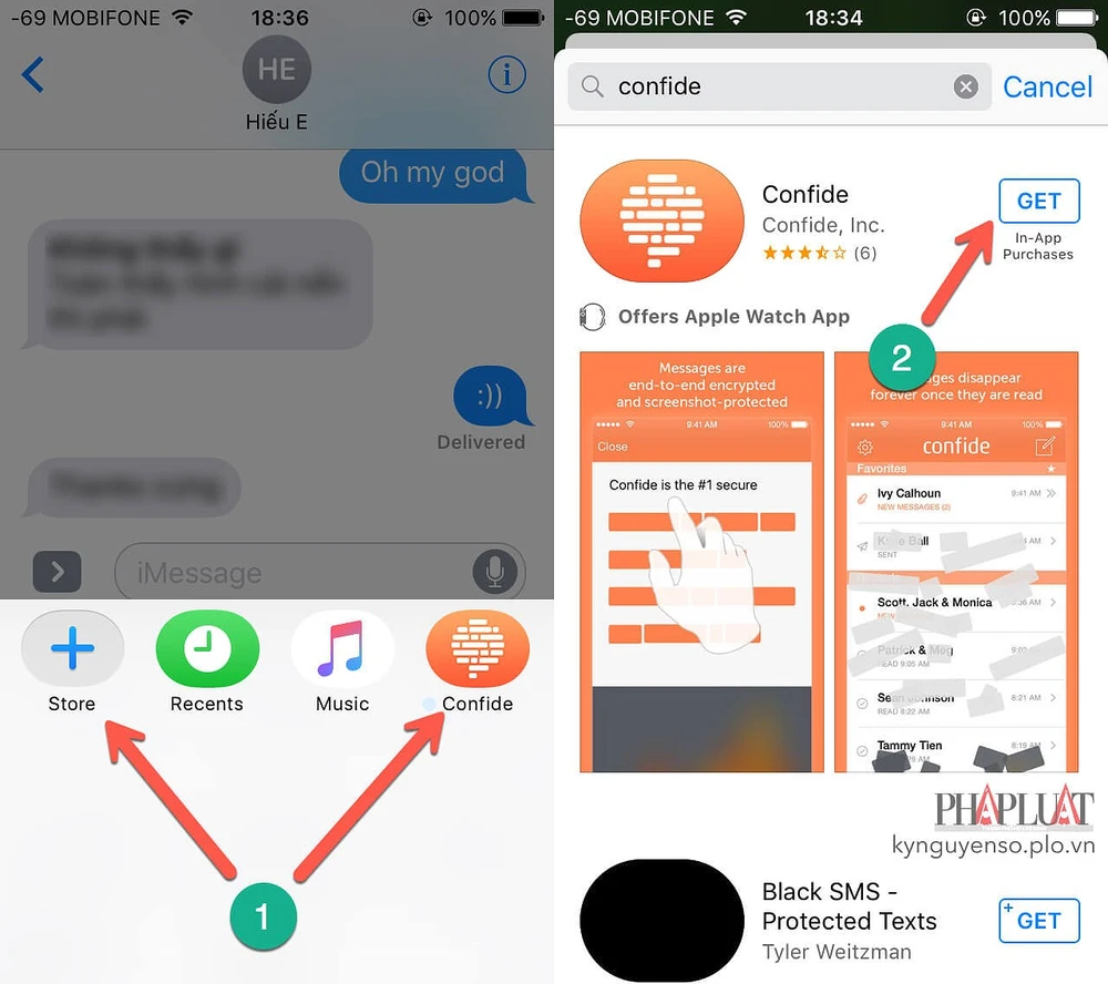 Nếu muốn tự hủy tin nhắn trên iPhone, bạn hãy mở ứng dụng iMessage, chạm vào biểu tượng App Store > Store, gõ vào khung tìm kiếm từ khóa Confide và nhấn Get để cài đặt. Hãy chắc chắn rằng thiết bị đang sử dụng iOS 10, nếu chưa, bạn chỉ cần vào Settings (cài đặt) > General (cài đặt chung) > Software update (cập nhật phần mềm).